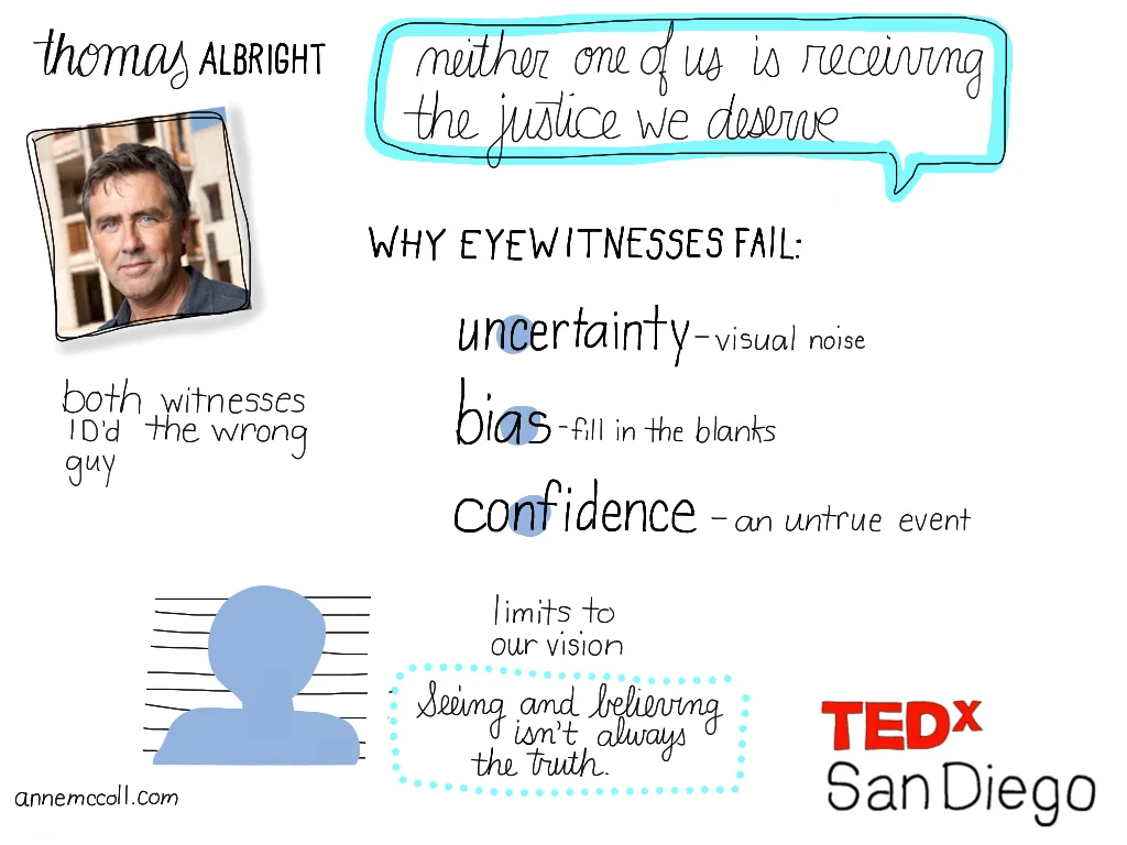 Thomas Albright, Professor and Director, Vision Center Laboratory at the Salk Institute, lists three reasons why eyewitnesses fail: uncertainty, bias, and confidence.